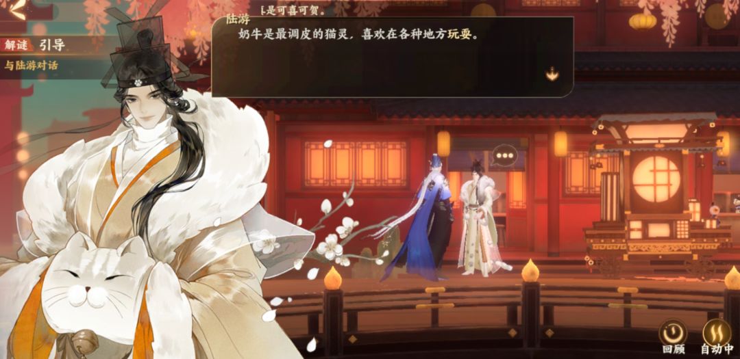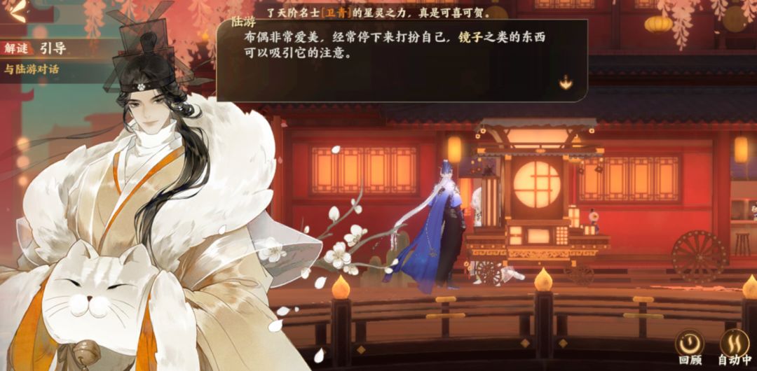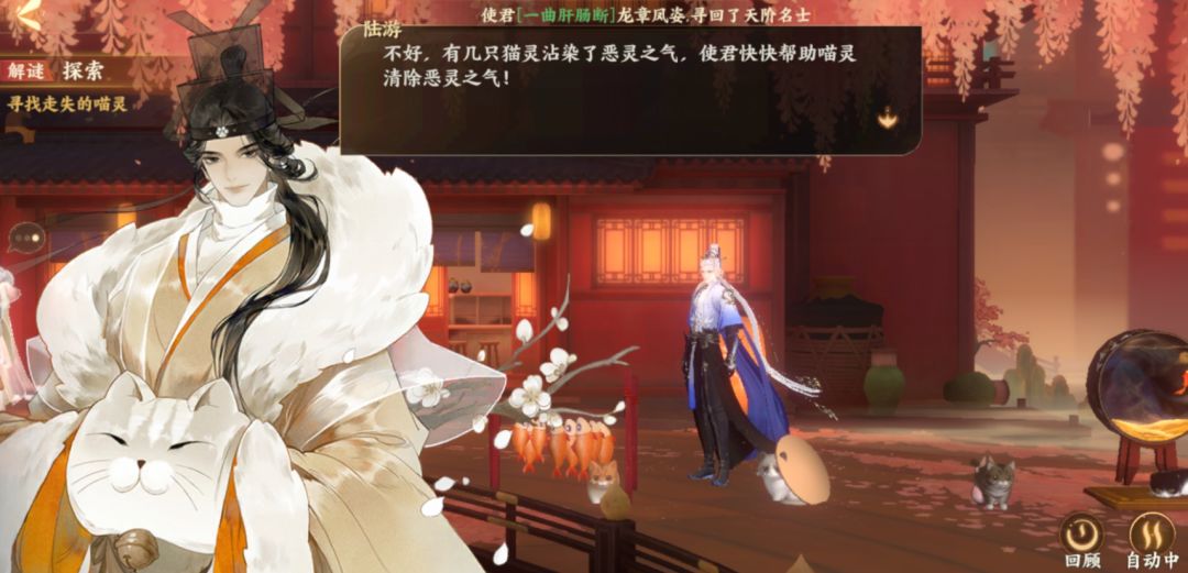 今天各位使君要开启一段寻猫之旅,进入风华录点击解谜·寻猫记,使君便会被传送到一处“秘境”。只见陆游这个“猫控”正愁眉苦脸的东张西望,想必他最近寻猫不是很顺利。