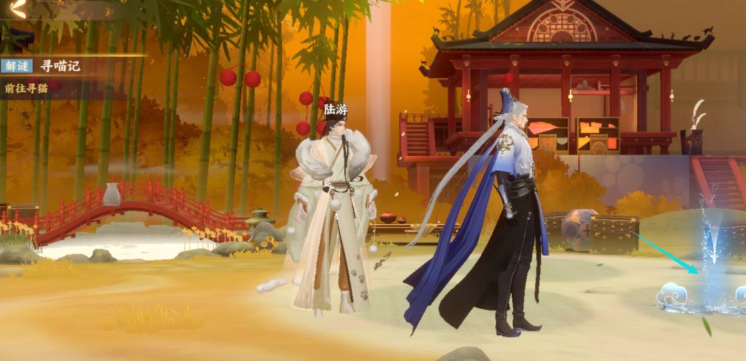 而作为一个有爱心,喜欢小动物的使君,自然要帮助陆游寻找猫灵啦。在与陆游对话完之后,右侧会出现一束蓝光,点击蓝光,使君便会被传送到下一场景。