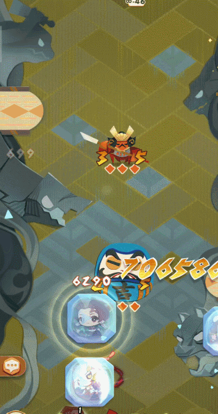 第46关会有一只黄盾达摩,它的黄盾免疫碰撞伤害且持续时间约等于无限,但是在这只达摩刚刷新出来的几个回合内,它的身上是没有黄盾的,我们可以趁它身上没有黄盾的时候迅速击杀它。