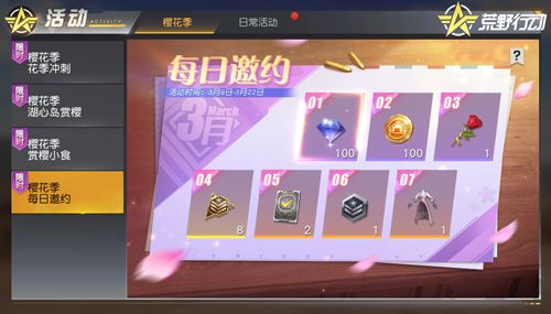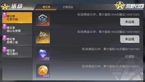 3月11日至3月24日,玩家们每日通过任务获取食材,完成订单获得高级军需勋章、至尊军需勋章碎片等收入奖励,累计收入达到最终目标值可以领取永久橙品大奖物资盒:落樱!