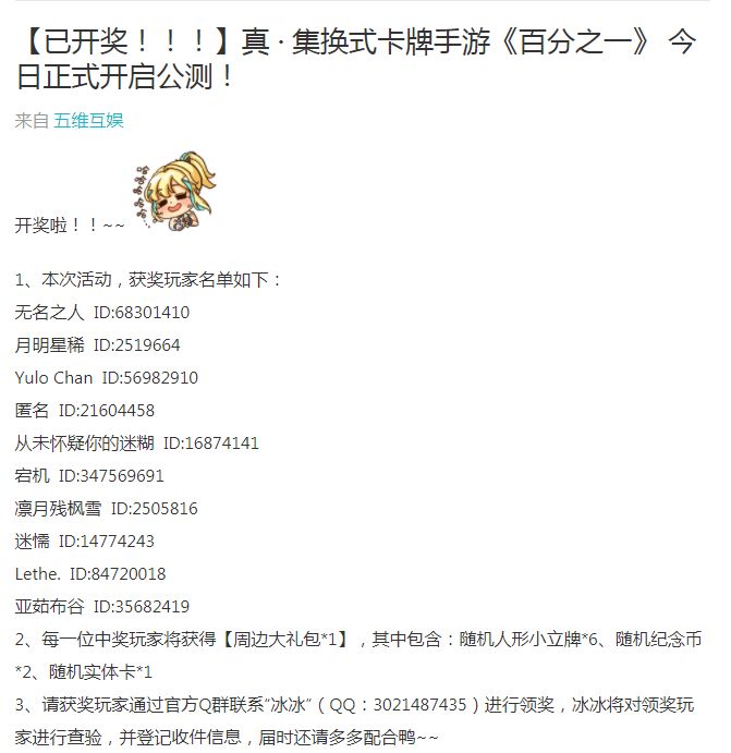 以上玩家请尽快QQ联系冰冰进行领奖哟~~冰冰QQ:3021487435,添加好友的时候记得备注自己是哪个平台的获奖玩家哟(#^.^#)
