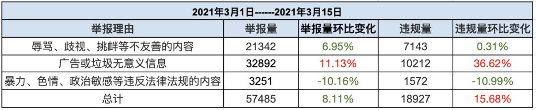3月上半旬,整体的举报量与2月下基本持平,举报量为57485条;但是实际处理的违规量有所提高,处理量为18927,环比上涨了15.68%。从中可以看出,Taper对维护社区和谐非常热情,而且举报的准确率也有所提高!
