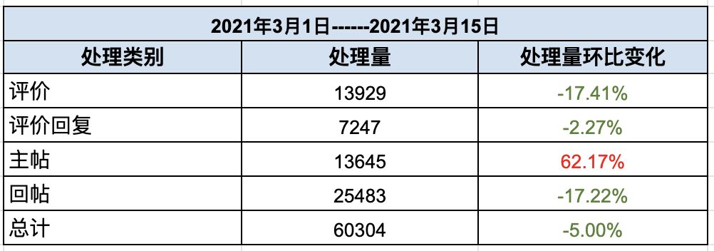 3月初的处理总量为60304,平均每日处理量约8615条左右。本期主贴的处理量由于集中处理广告的原因,有较为明显的上升,其余内容的处理量都有所下降,小管家有明显看到社区氛围改善,还望各位Taper们与我们一起前行!