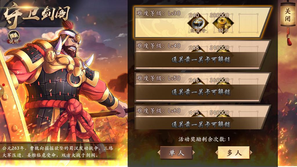 守卫剑阁玩法30级即可解锁,玩家可以率领自己的军队在守卫剑阁中抵挡魏国精锐敌人的进攻,参与活动即可获得白虎令