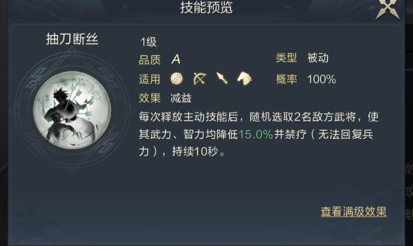 抽刀断丝做为一个被动战法,其作用就是提供负面效果,降智、降武、禁疗都属于负面效果,同时降智能提高后面乘间击瑕的最终输出且同时降低对方的智力输出,降武就只能降低对方的武力输出,所以抽刀断丝是能够限制大幅度敌方输出且能过提高我方智力输出 这时我们通过携带半济而击触发抽刀断丝做前置,提高我方的智力输出,然后就是乘间击瑕,因为抽刀那里只能提供两个负面效果,所以可以考虑在配合一个风诡云谲(烈火燎原、水无常形、忌克妒魅)提供负面效果,因为如果后续给予负面效果和抽刀的目标叠加那么这类的负面效果会得到输出提升,如果没给到抽刀的相同目标,那么乘间击瑕的输出目标会增加为全部目标,从而大幅度提高我方输出。