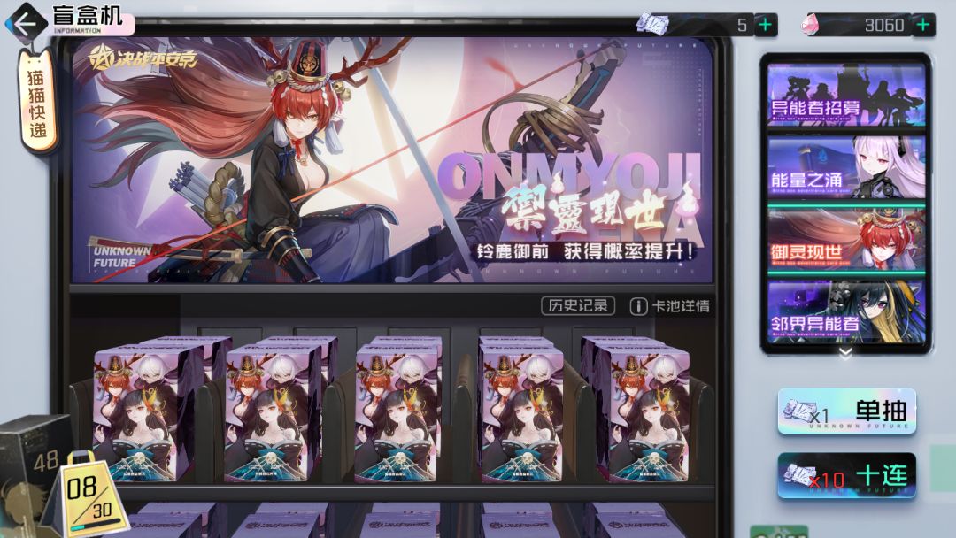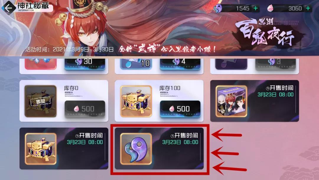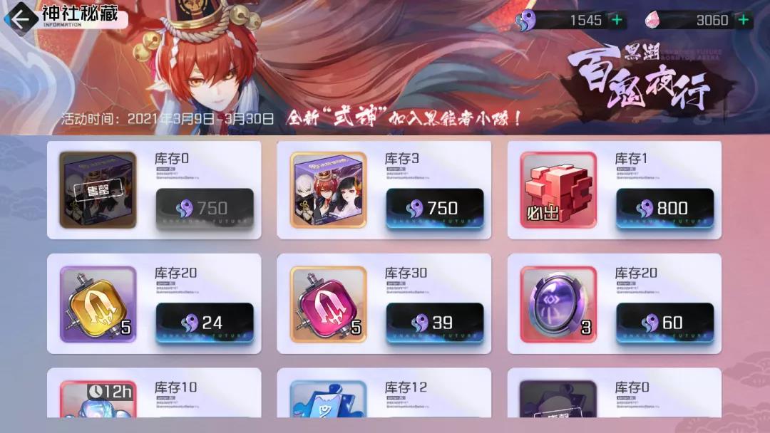 联动新角色铃鹿御前盲盒抽取概率限时提升:2021年3月16日--2021年3月23日(铃鹿御前占2.0%,以津真天、彼岸花各占0.25%)