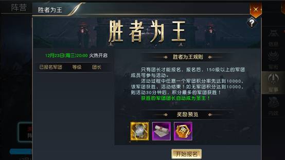 Ø 胜者为王:开启时间:开服第3天、每周三20:00;报名规则:需要150级以上阵营且只有圣主才能报名,报名后,【1转】50级以上的阵营成员可参与;获胜条件:活动过程中任意一个阵营积分率先达到10000,该阵营获胜,活动结束。如无阵营积分达到10000,则活动30分钟后,积分最多的阵营获胜;获胜的阵营圣主自动成为圣主。