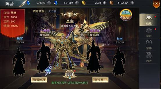 游戏有两个阵营,分别是光明和黑暗,后续部分玩法加入阵营后方可参与。