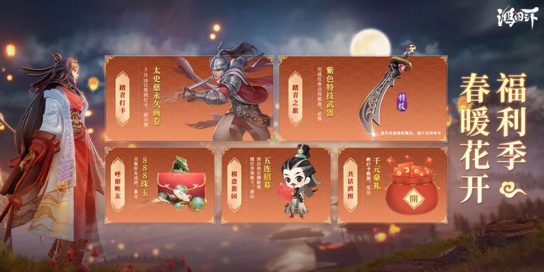 踏青打卡活动已开启,3月18日登录游戏打卡,可获得永久武将画卷哦!