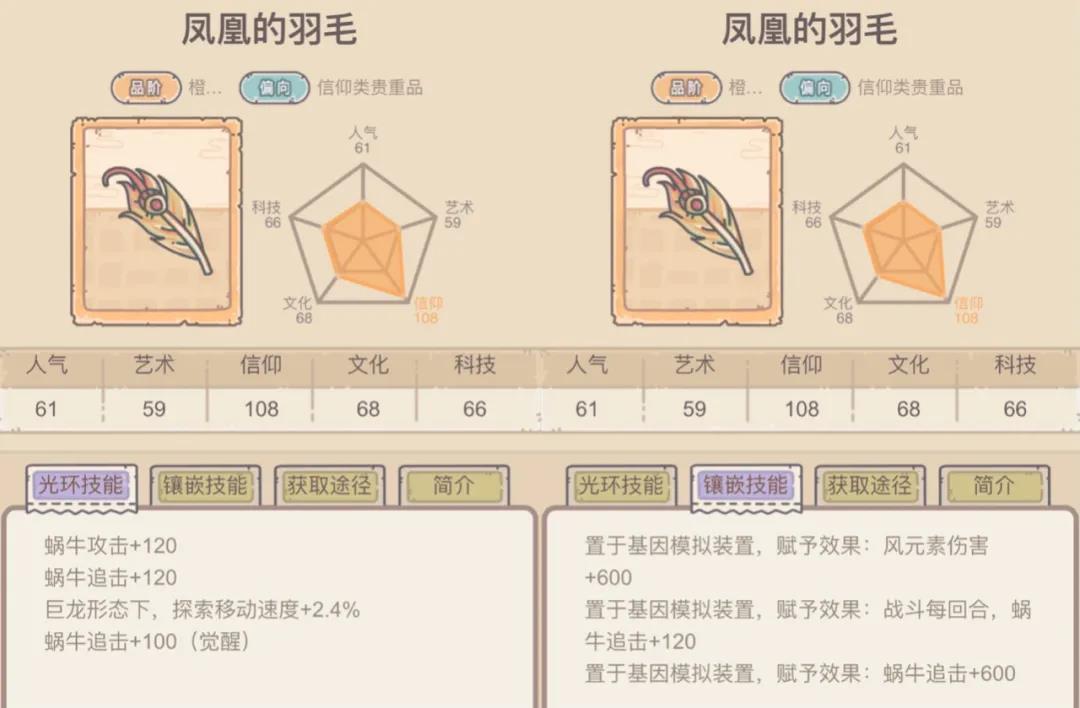 置于基因模拟装置时,风元素伤害+600(了解元素伤害是什么请关注最强蜗牛攻略公众号:【最强蜗牛】元素伤害-不同的面板攻击,元素伤害的收益不同),每回合追击+120,追击+600