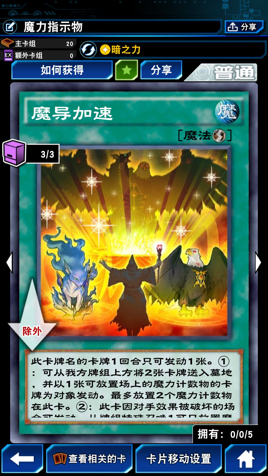 魔力引导者配合魔导加速可以直接四个魔力指示物,如果丢弃的有怪兽卡就直接可以特招怪兽,感觉这个魔导加速就是专门为这些需要3个以上魔力指示物的怪兽卡量身定制。