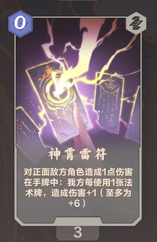 用法术加伤害,但因为是非指向的所以需要亿点点预判,有点吃运气,满伤挺高,但一般不会攒到满伤,用来解随从比较好用(雷的解场能力真的不太行),也可以用来补伤害比如放大哥战傀后面战傀把对面怪打死了,一个雷符直接打脸,但这种情况还是比较少的,总的来说预判(运气)到了很厉害。
