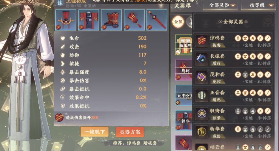 每个名士都有适合自己的灵器套装,主输出的名士可以使用惊鸣套装,可以大幅度提升名士的输出能力。系统都有为每位名士推荐灵器套装,点开灵器可以查看灵器的套装效果。