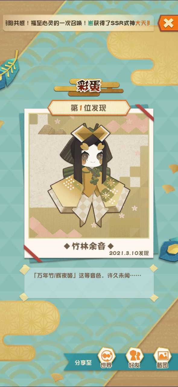 「竹林余音」辉夜姬+万年竹 ,触发条件:万年竹吹笛时点击万年竹