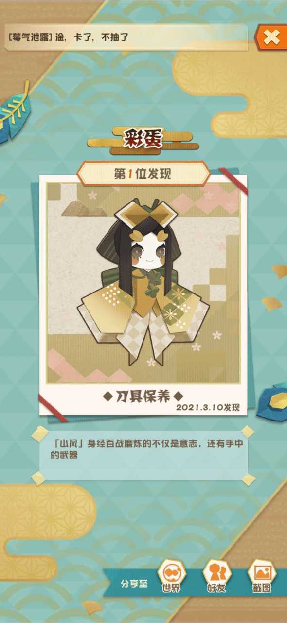 「刀具保养」山风,触发条件:山风拔刀时点击他