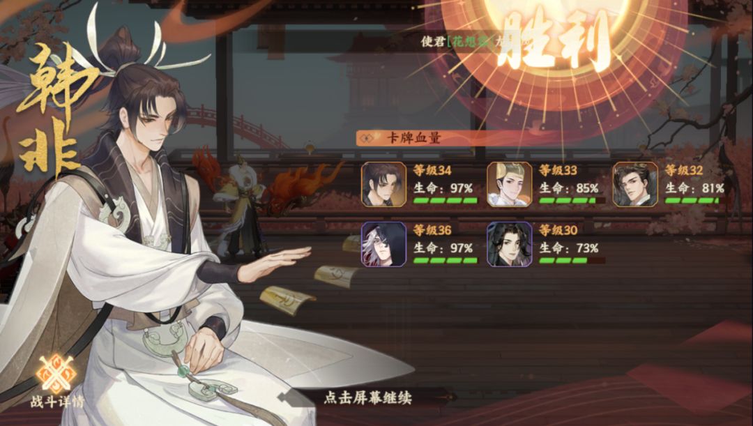 战斗关卡:派遣五位名士进行战斗,且名士的战斗状态会被保留,延续到下一次战斗。且每次通关战斗关卡后,使君都在路线界面选择“编辑”进行阵容调整。