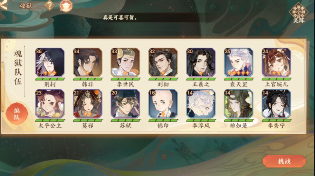 使君每日只可挑战一次魂狱,且使君在进入魂狱的一开始就需决定好一同前往的14位名士,名士的战斗状态(真元、生命值、技能冷却等)将被记录到下次战斗,且名士退场后不能再次参战。