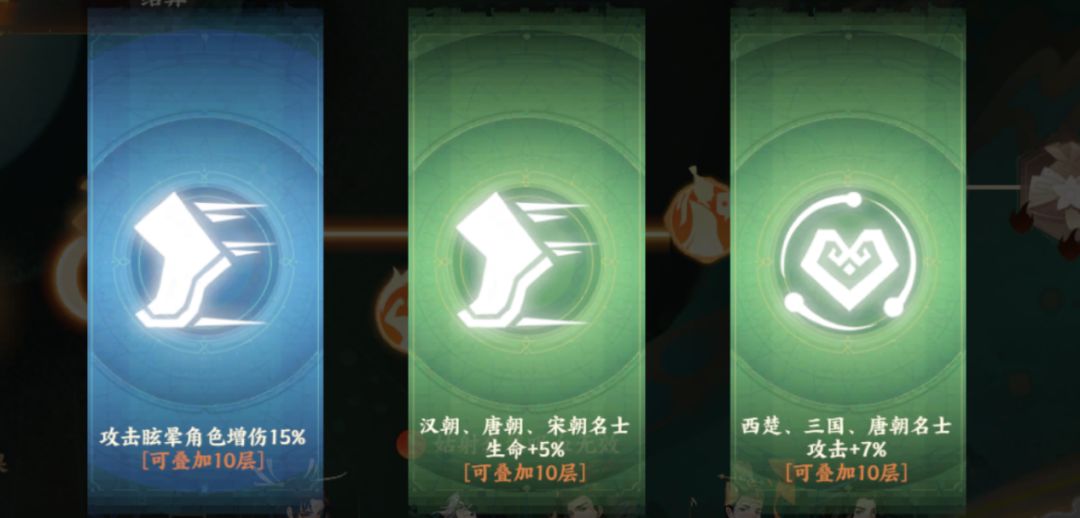 增益关卡:每个增益关卡会提供三个增益效果供使君进行选择其中一个。