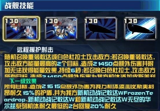 随机召唤重装敢达或白色杜拉士攻击敌方;若召唤重装敢达,攻击敌方能量最高的2个目标,造成21450点额外伤害并附加无法获得能量效果,持续6秒;若召唤白色杜拉士,攻击敌方所有目标,造成21490点额外伤害为我方机体添加皮斯美利昂15%的护盾,并为我方新机动战记敢达WFrozenTeardrop、新机动战记敢达W和新机动战记敢达W无尽的华尔兹系列机体耐久最低的2台回复20%耐久