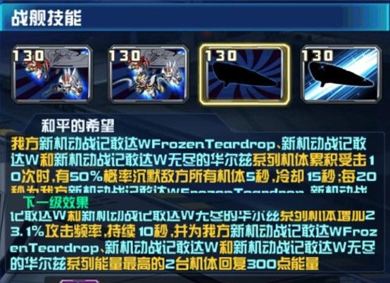 我方新机动战记敢达WFrozenTeardrop、新机动战记敢达W和新机动战记敢达W无尽的华尔兹系列机体累积受击10次时,有50%概率沉默敌方所有机体5秒,冷却15秒;每20秒为我方新机动战记敢达WFrozenTeardrop、新机动战记敢达W和新机动战记敢达W无尽的华尔兹系列机体增加23.0%攻击频率,持续10秒,并为我方新机动战记敢达WFrozenTeardrop、新机动战记敢达W和新机动战记敢达W无尽的华尔兹系列能量最高的2台机体回复300点能量