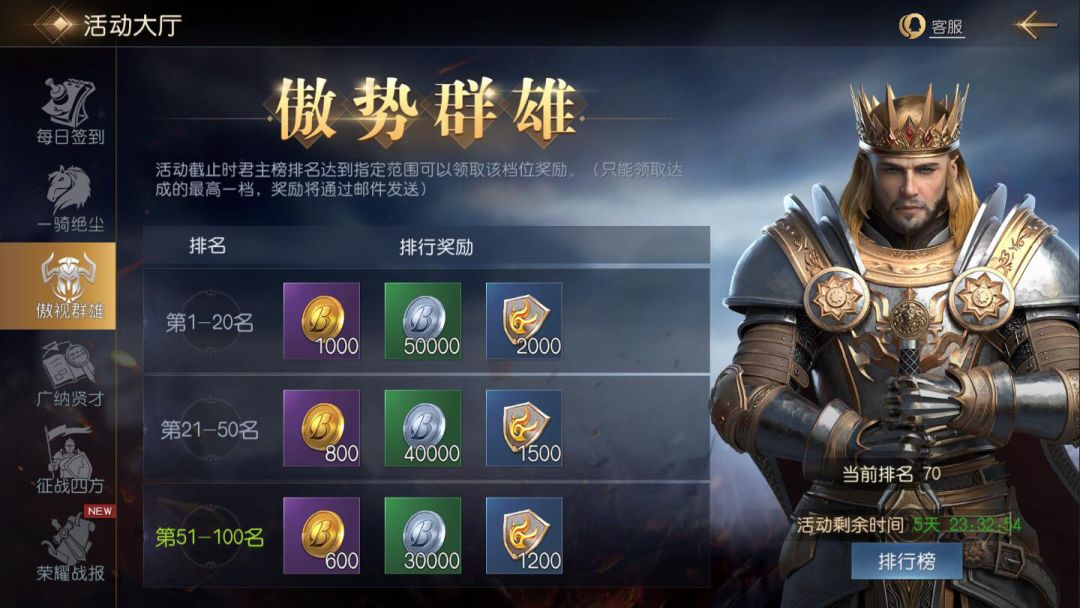 个人排名前1000名,即可获得100金币,10000银币,500技能点