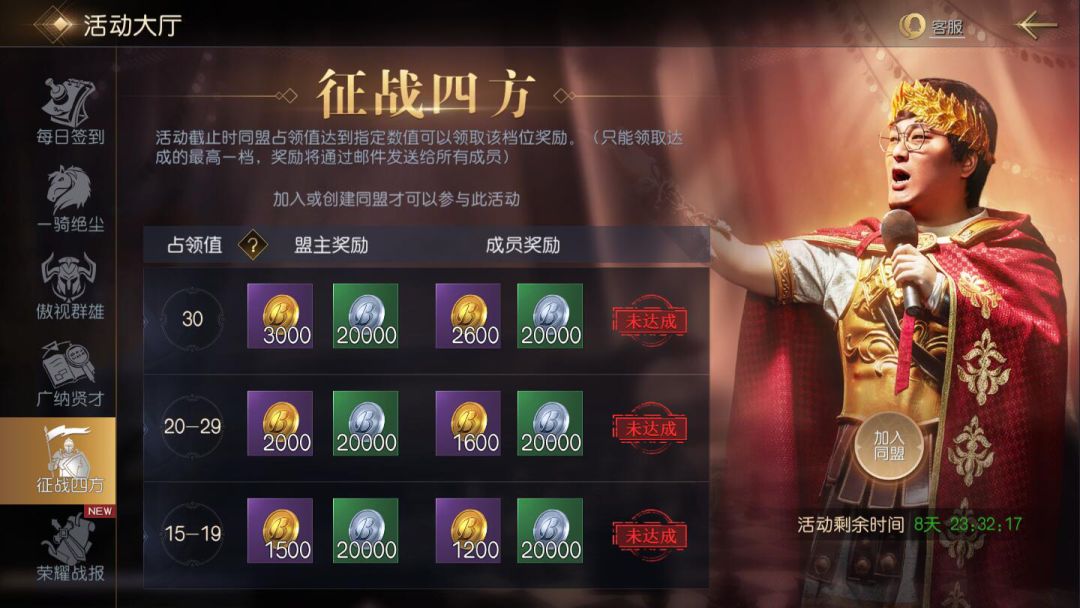 完成方式:加入公会,与公会成员一同攻占符合条件的城市;在活动时间内,尽可能的占领更多的、等级更高的城市,提高积分;积分达到指定标准,即可解锁金币