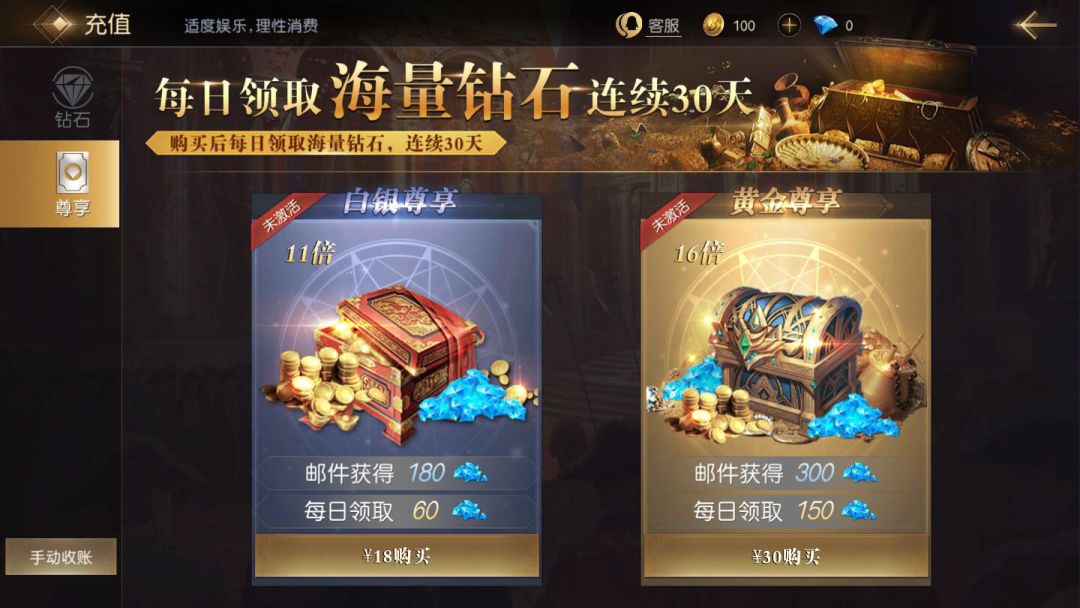 完成方式:划分18元或30元两个档次。购买后,每日通过邮件发放赠送对应额度的金币;不同档次的尊享卡可以累加购买。