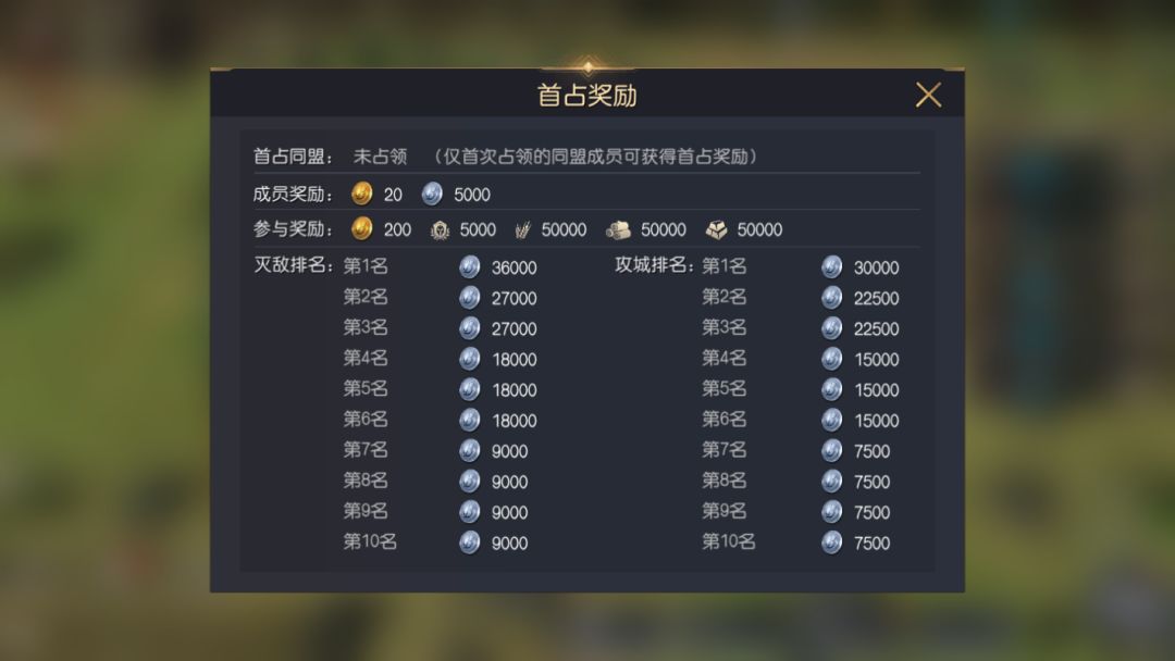 而占领分5分,盟主即可获得500金币,非盟主则能获得300金币;占领分30分,盟主即可获得3000金币,非盟主则能获得2600金币。