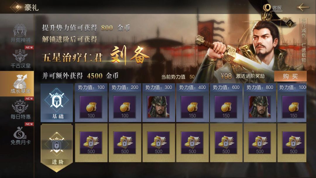 【奖励加码】活动期间内,你还可以选择累积充值98元以上,开启更高等级回馈的奖励,最高可领4500金币、五星将领。