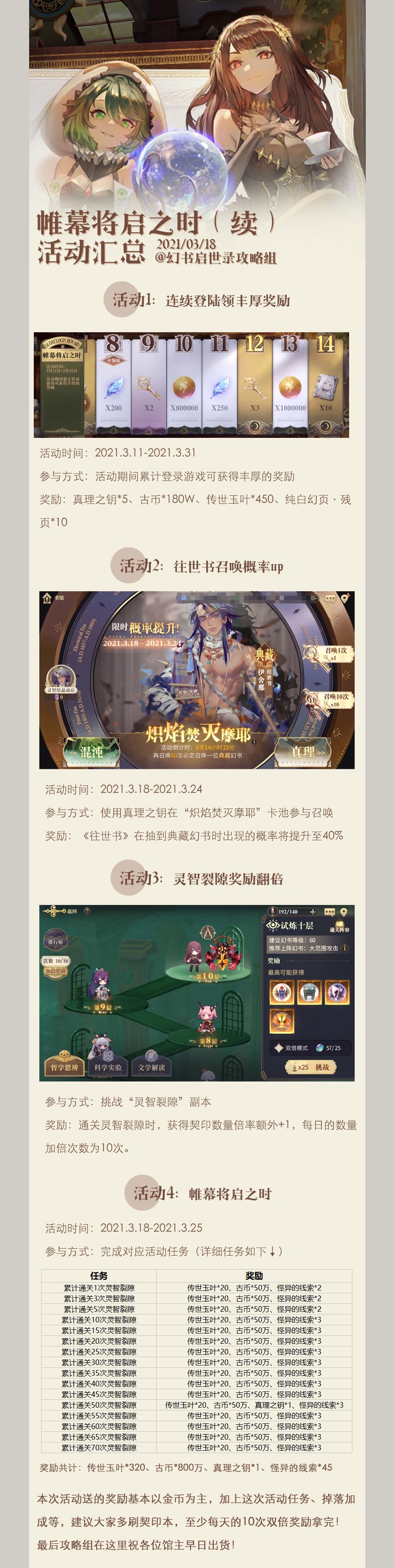 本次活动送的奖励基本以金币为主,加上这次活动任务、掉落加成等,建议大家多刷契印本,至少每天的10次双倍奖励拿完!