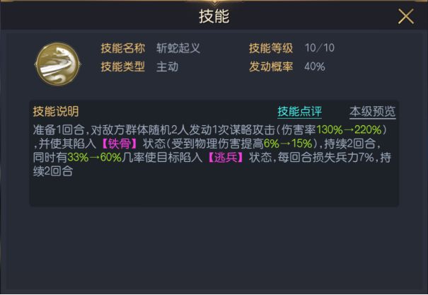 效果分析:【斩蛇起义】这个技能可以打出群体2人的谋略伤害和【逃兵】状态,实际伤害率非常高,除此之外还可以提升敌方受到的物理伤害,变相地提升了我方友军的战斗能力。施加的负面效果与其他技能有充分的联动可能。