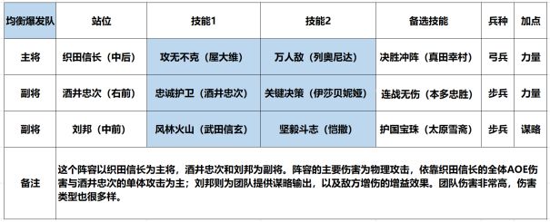 在阵容搭配时,推荐【织田信长+酒井忠次+刘邦】。这个阵容以织田信长为主将,酒井忠次和刘邦为副将。阵容的主要伤害为物理攻击,依靠织田信长的全体AOE伤害与酒井忠次的单体攻击为主;刘邦则为团队提供aoe谋略输出以及各种减益效果,团队整体的伤害非常高,伤害类型也很多样。