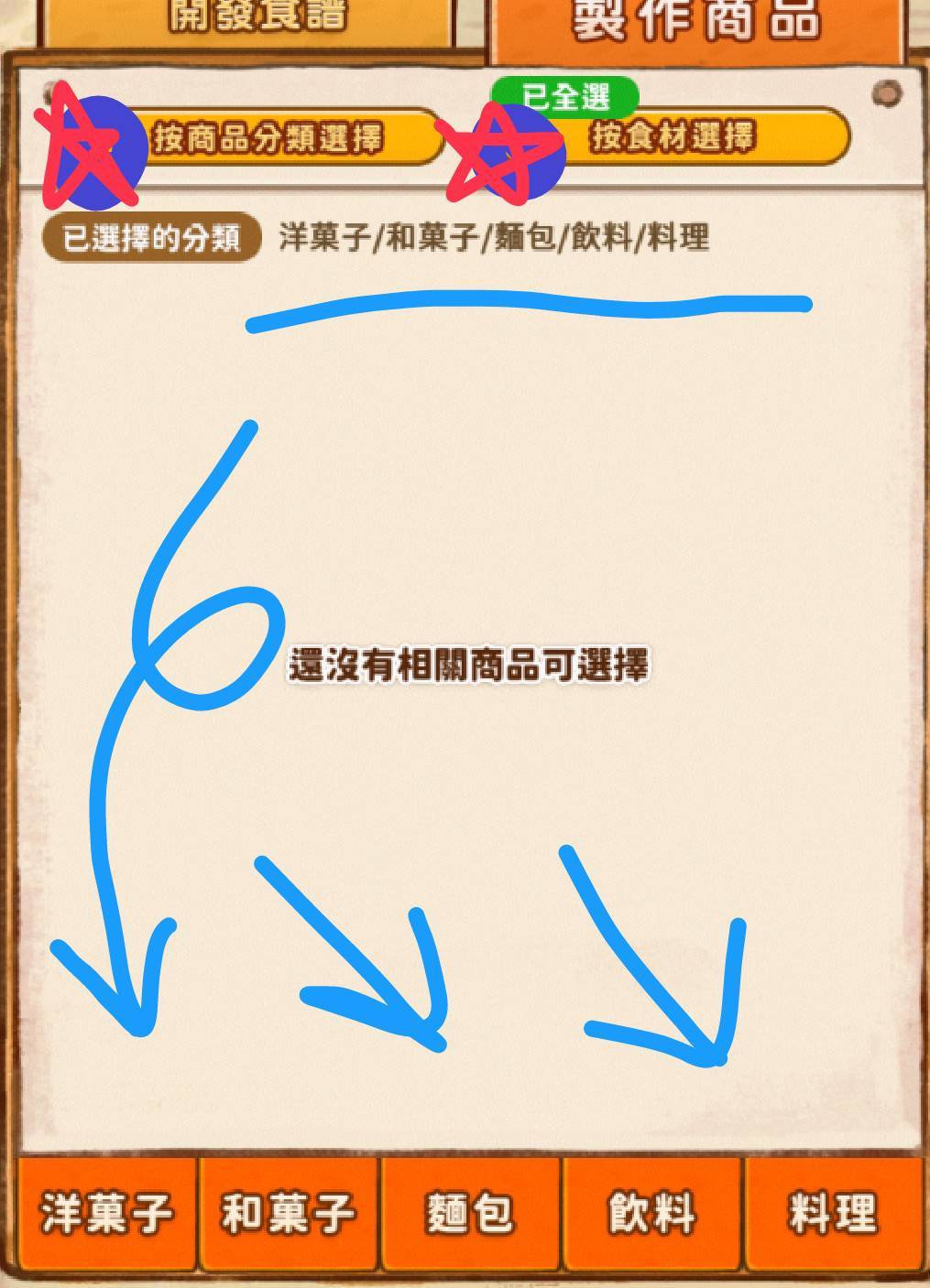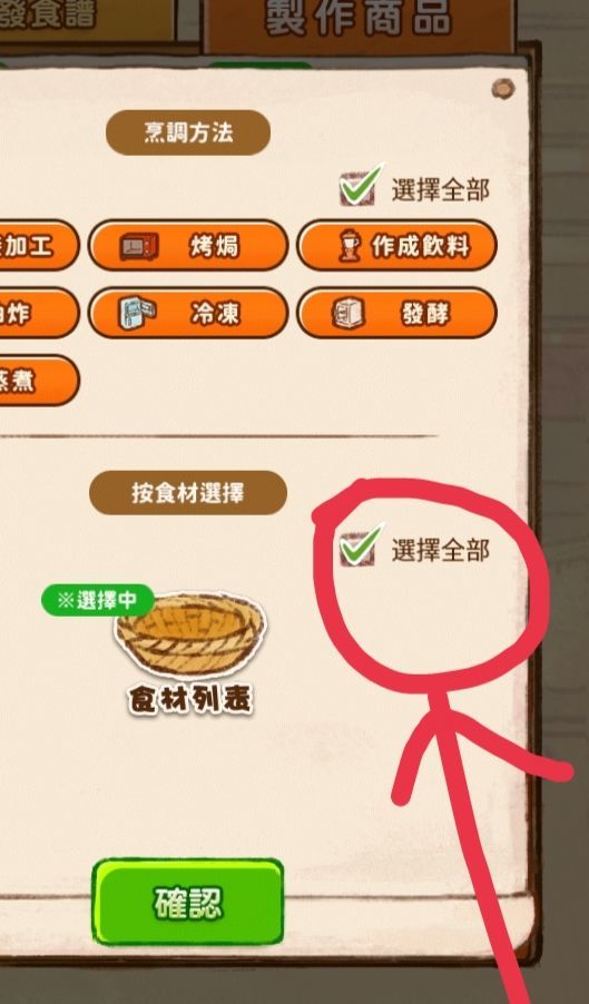 這些全選有選到,在第一張圖藍底紅星的部分會顯示綠底的「已全選」,通常這時候應該就會出現已經開發的食譜了。