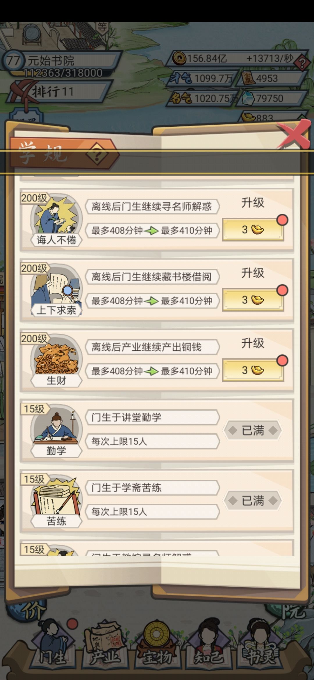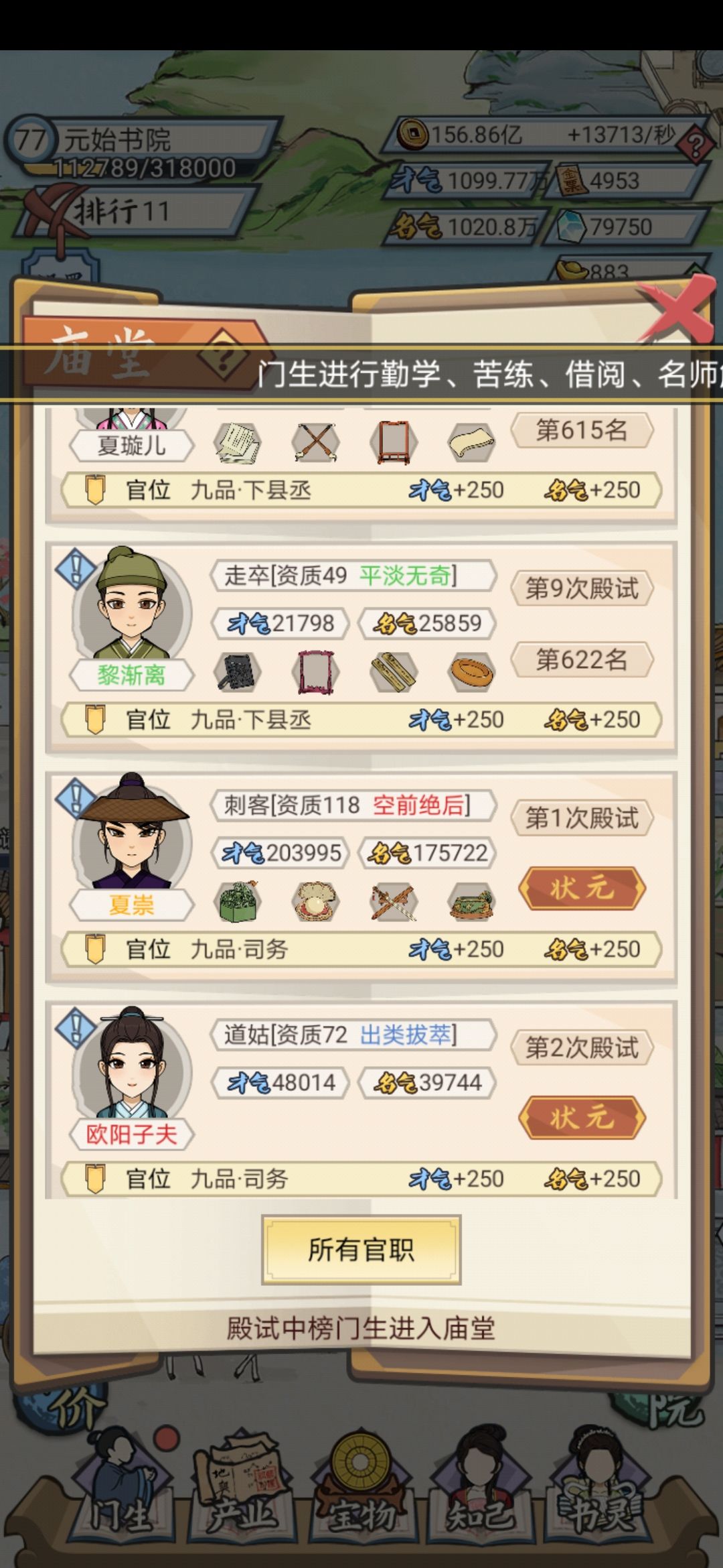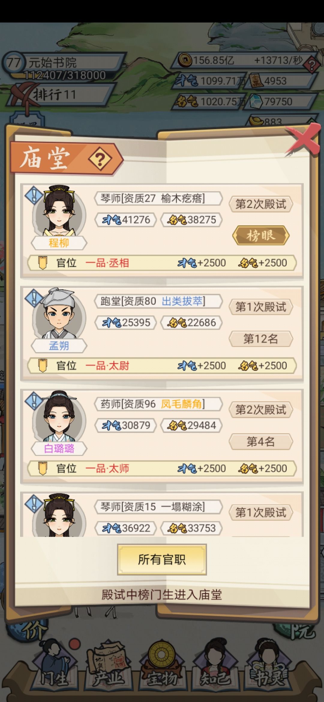 只能在第11名,前十已经无望。学规200级还没有满。后面两幅图,你会发现,人物的才气,名气和资质,基本跟几品没有关系,都是随机的。挂机时间越长,才气和名望越多。进了庙堂,这个人物就算完事了。