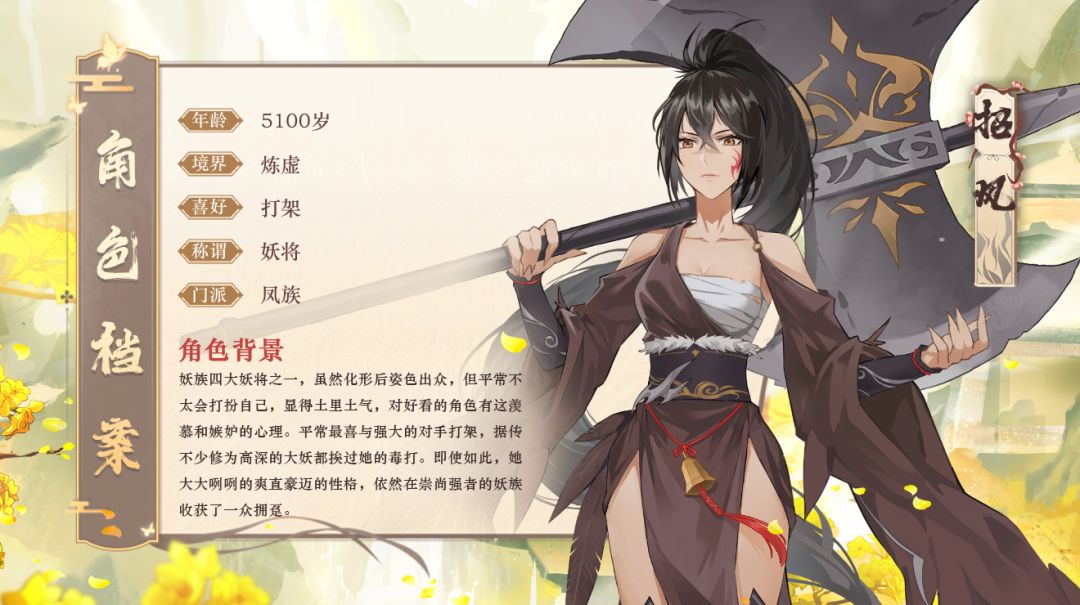 招风是妖族四大妖将之一,虽然化形后姿色出众,但平常不太会打扮自己,显得土里土气,对好看的角色有这羡慕和嫉妒的心理。