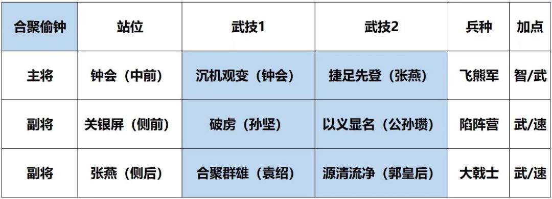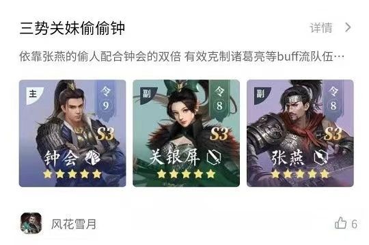 秃秃点评:以钟会+张燕+关银屏组成的新套路,张燕负责偷取敌方BUFF共享钟会,钟会依靠捷足先登刷新Buff触发伤害。另一名主C没有挑选陆抗,而是选择了以闪避反击为主的关银屏,义显交给关银屏能降低钟会前期承伤,生效后可提高双C的整体强度,加上破虏的效果,队伍有概率3人都刷出闪避,输出链的容错率比较高,整体坦度与输出也很优秀,但续航较低。