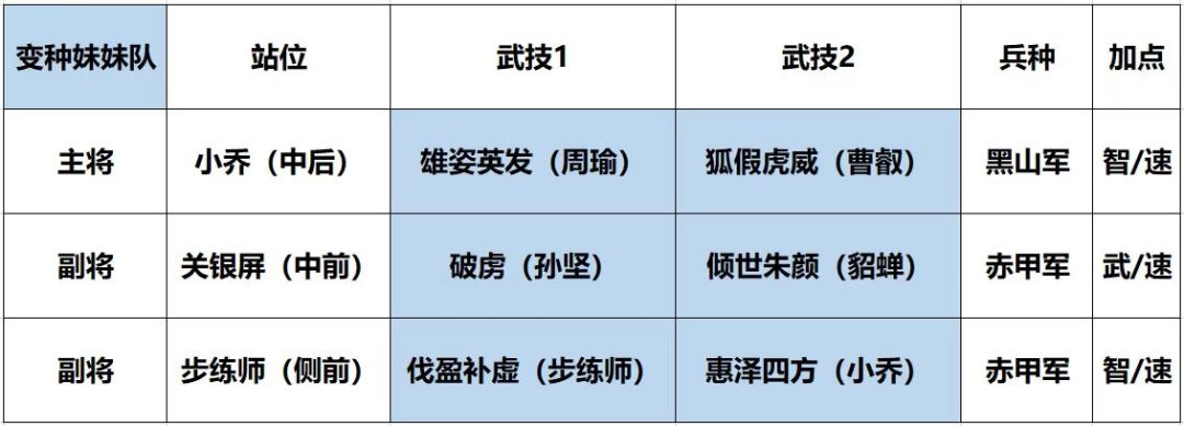 秃秃点评:放弃了鸿图主流的国家队、三势队打法,采用混搭的形式组建出的新妹妹队,在原基础上将大乔换为关银屏,一定程度上提升了队伍前排的承伤与输出能力,配合小乔能造成不错的输出率。该队伍整体坦度极高,拥有步练师属性提升、倾世朱颜减伤、破虏闪避、天香技能闪避、闪避反击沉默,能与大多数队伍正面一战。2.风花雪月