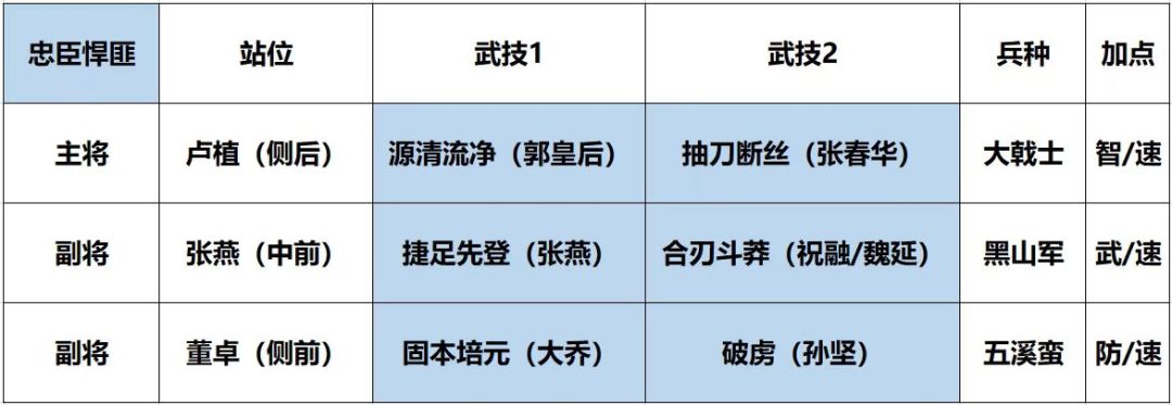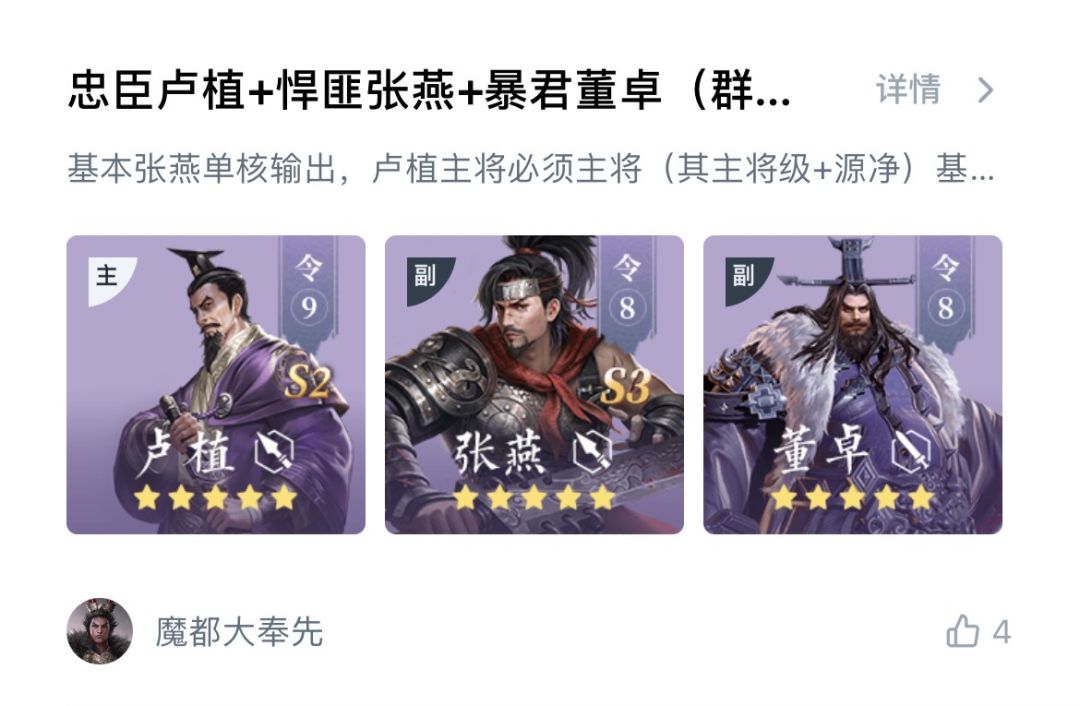 秃秃点评:这套阵容是少见的单核张燕队,该队伍依靠快速为张燕刷新Buff来触发捷足先登的伤害,卢植主将可稳定为其提供增益状态,同时抽刀削弱敌方属性并禁疗,配合董卓的自带技能对武力伤害的提升,单核张燕也能打出非常高的输出,如果敌方是多增益队伍,那么张燕的输出能力可再上一层,即使是常规队伍,张燕也能靠自己队伍内提供的增益触发不错的伤害。