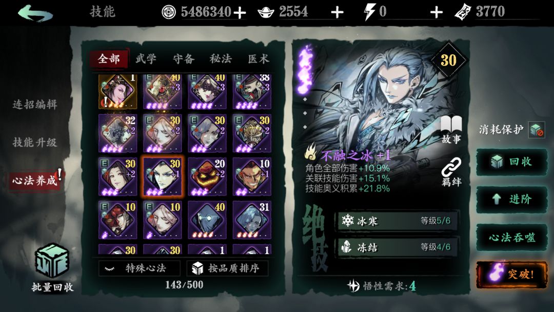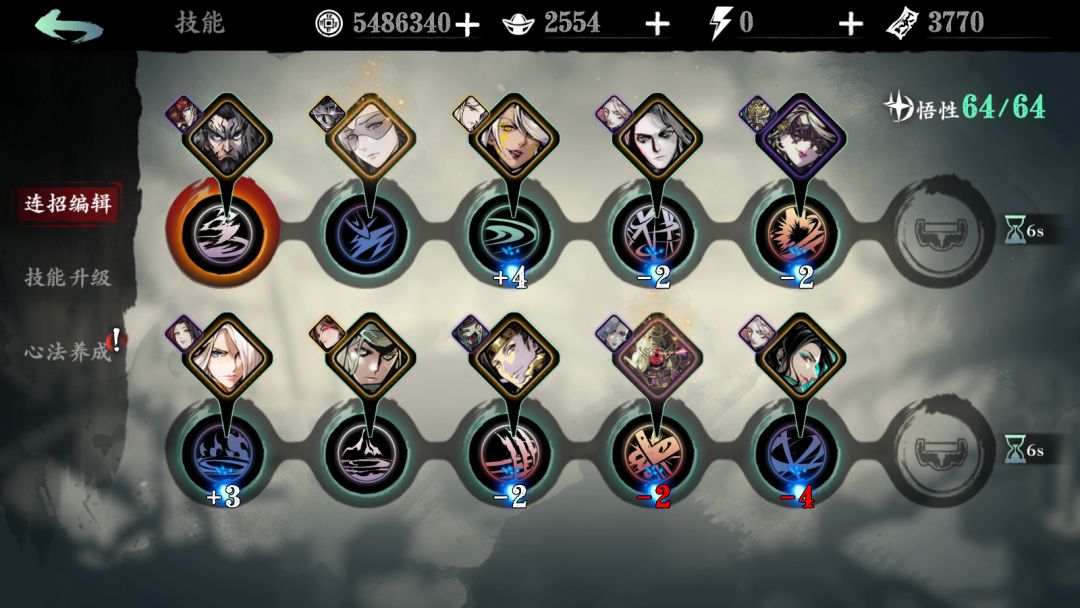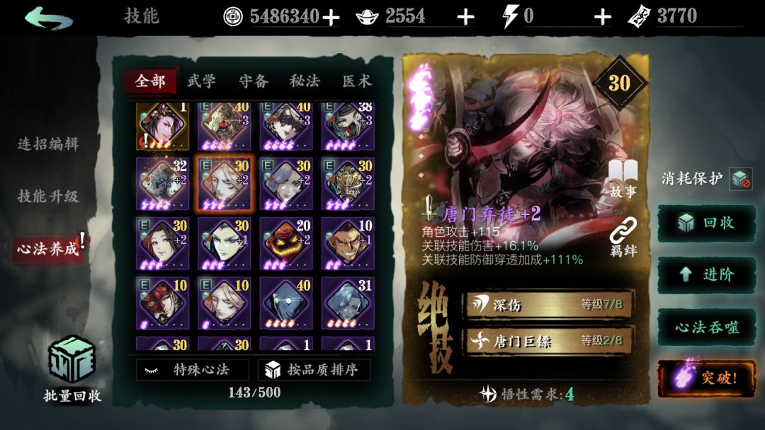 萌新一定要注意的是,魔堡古人这个心法,在得到的时候,就尽力将绝技1吃满,因为加的是百分比的攻击,而且几乎是必备卡,所以这点一定要注意,我现在这个……随缘吧