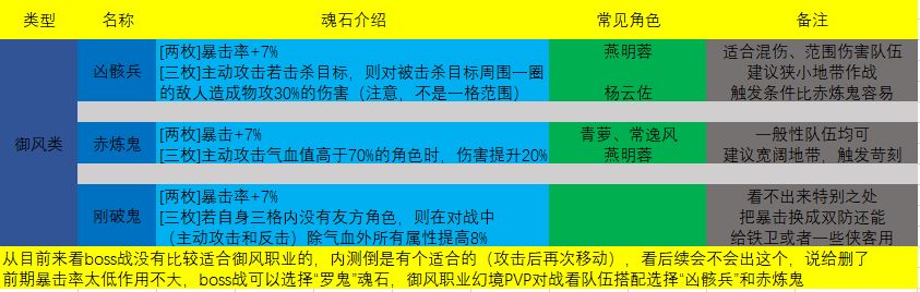 御风职业的角色,特点有很多:脚程好、可隐身、可腾空。角色不同多具有的特点也不同,但所以的御风职业角色都有高暴击这个特点,这也是为什么把暴击词条归到“御风类”魂石的原因。