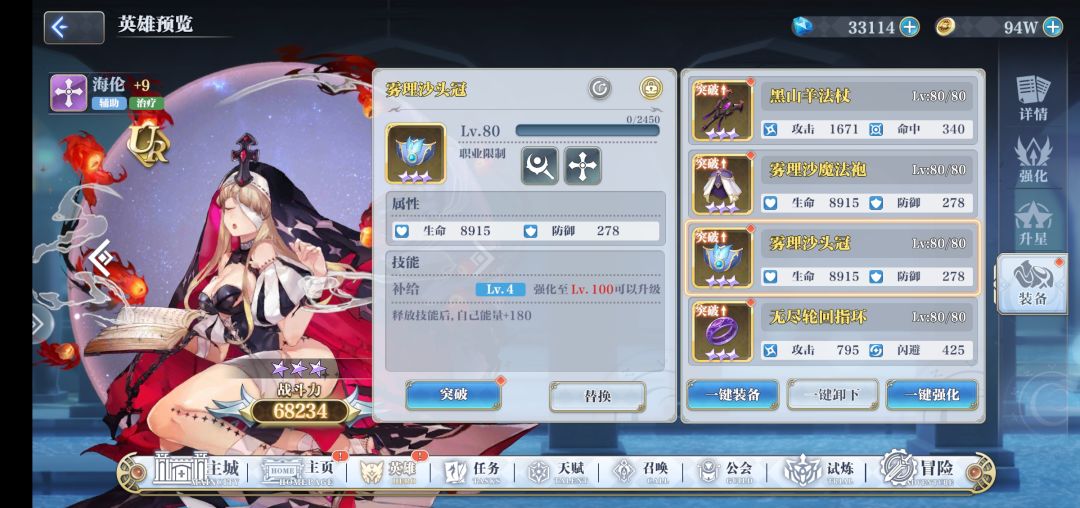 3.关于装备,分类太多,太杂。有兴趣的可以翻翻前面的帖子,有大佬专门把所有装备都统计过,感兴趣的人可以自行比对。简单说的话就是奶妈需要奶量加成的装备(其中海伦需要能量回复装,头盔建议带那个释放技能队友加攻击的),除此以外有一件比较有意思的头盔,就那个释放技能过后减少对面全体攻击力的那个给伊西斯有奇效,个人感觉是奶妈和辅助比较好用的头盔。ad输出刺客类无脑碎星镖+增伤头+爆伤戒指就完事了,衣服目前来看白骨衣服是最适合刺客和ad的;而ad(其实也就只有风魔),装备爆伤弓最优,但需要幻境币对换,没有的话蝴蝶镖也可以,但伤害浮动较大,个人酌情使用。神乐实锤工具人,但高星神乐输出不俗,毕业武器是同样幻境币兑换的恶魔弓,但鉴于幻境币可怜的产量和兑换需要的数目,个人不建议兑换,真爱可以无视。简单来说幻境币优先兑换增伤头盔,其次是风魔毕业武器爆伤弓。注意:鉴于风魔极快的技能释放频率以及技能后必定暴击特点,风魔最优头盔不是增伤头而是紫罗兰头,实测二者伤害相差无几,而需要增伤头的单体输出除去神乐还有三位(米迦勒、蔷薇、格雷尔),故而建议风魔佩戴紫罗兰头盔即可。坦克装备较为简单,所有可以减伤的装备都是坦克的最优选择,其中注意反伤甲较为特殊,可以拿来给即将实装的路西法用来打boss,boss高额的伤害反甲也可以提供不俗的输出。法师队这一块由于我法师只用伊西斯,所以对法师装备不是很了解,但个人认为法师武器这一块黑山羊永远的神,诅咒法杖依然是诅咒角色带收益最大,燃烧法典给梦魇带打pvp有奇效。首饰这一块由于目前没有其余属性的攻击ur首饰,故仍然建议带爆伤戒指。