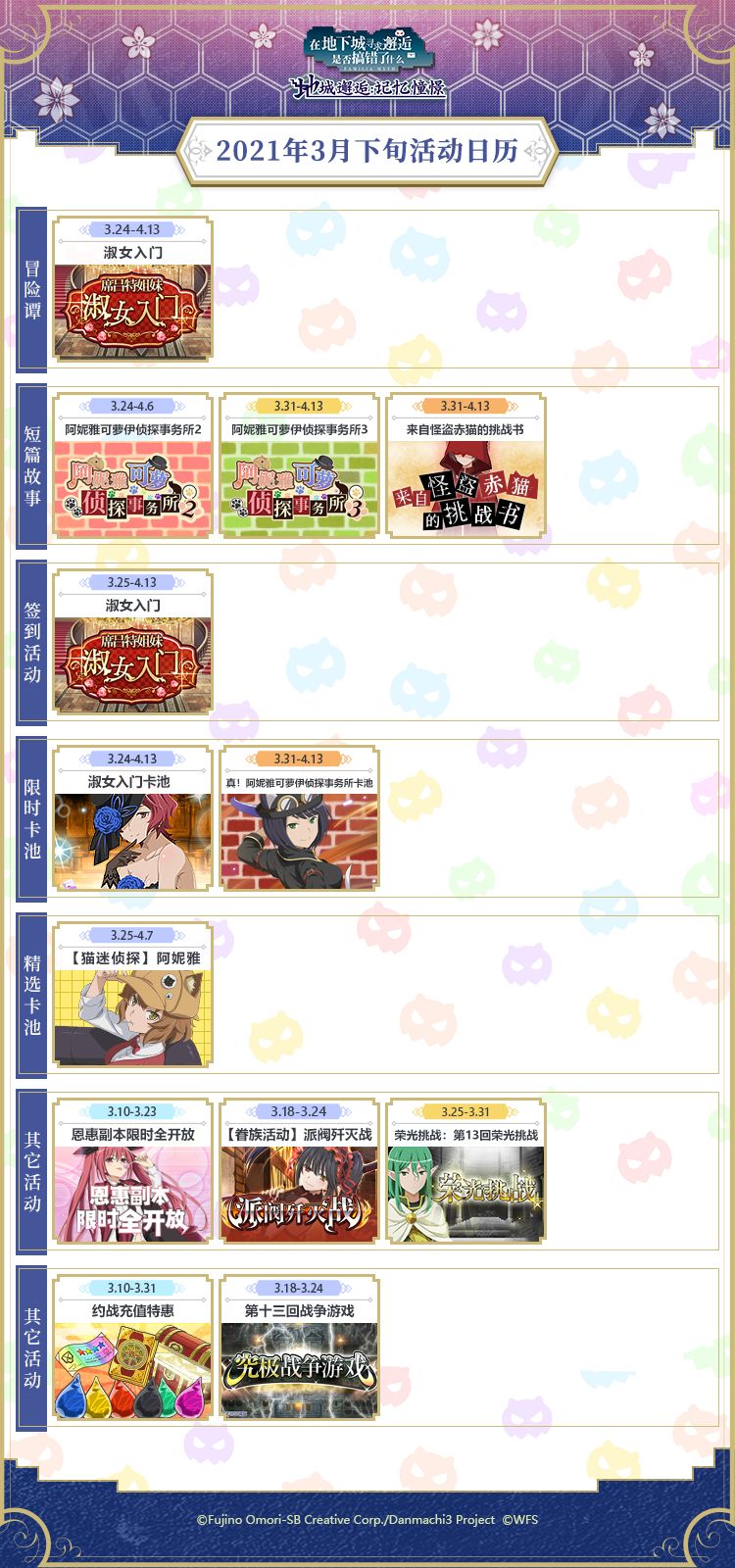 3月下旬的活动日历就是这样了喵,3月下旬的活动涵盖了席吕特姐妹淑女入门和阿妮雅可萝侦探事务所2&3两个主要的活动呢~~冒险者大人们不要错过喵!今后也请多多支持《地城邂逅:记忆憧憬》!