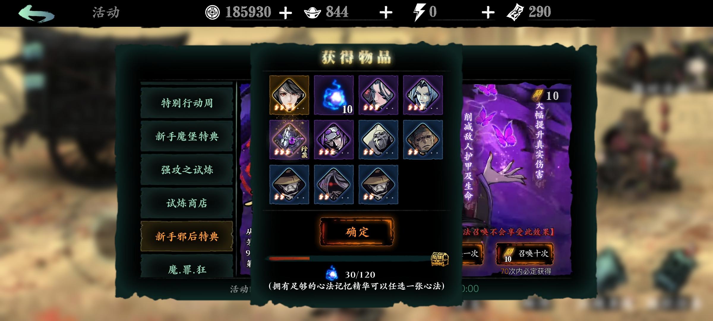 这时我发现了我攻略的一点点小不足,我推荐前期抽一百抽,现在我觉得一百二十抽比较好,因为120抽给的蓝色灵魂可以任选一个普通金心法