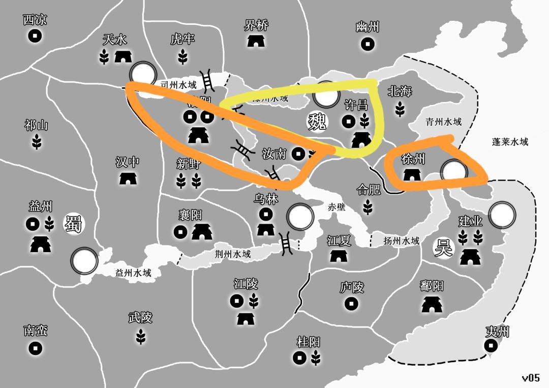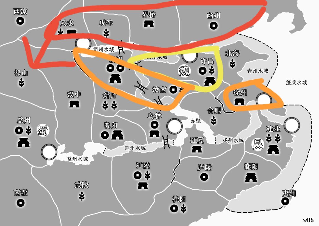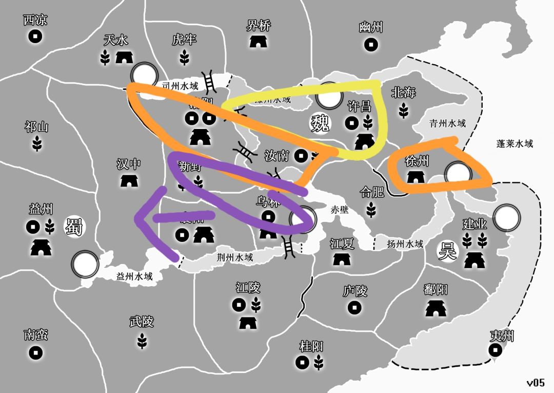 之后魏一般是在北方圈地放占领标志,与蜀打架,一方向是天水。另一方向是新野乌林,要看外交,得到东吴赤壁水军支援可作突破