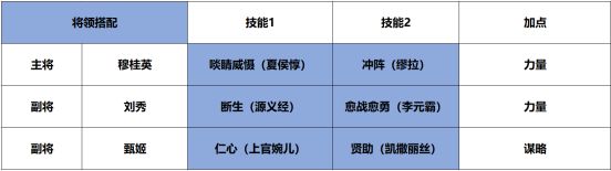 该阵容中穆桂英与刘秀都拥有非常强力的输出能力,穆桂英可利用自带技能强化后续的主动技能输出,即使只搭配2个稀有技能也可打出媲美传说级的伤害,同时带有缴械效果,刘秀可对带有负面的敌人造成额外伤害,自身再搭配一个负面技能后即可稳定强化自身输出,队伍整体的伤害率非常不错,甄姬则负责提供大量恢复效果,可以很好的补充坦度不足的缺点。
