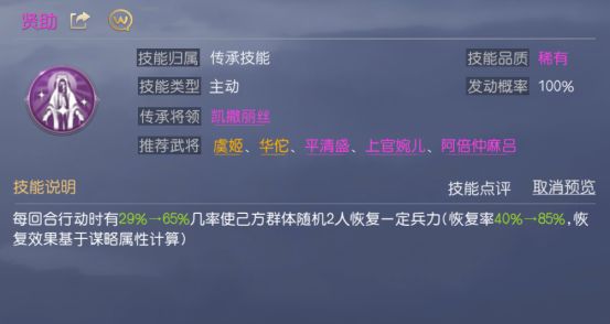 贤助在每回合行动时都有较高的概率会己方2人恢复一定兵力,虽然恢复率较低,但可通过甄姬高额的谋略属性提高实际治疗量,同时该技能每回合都有几率触发,整体治疗更加稳定。