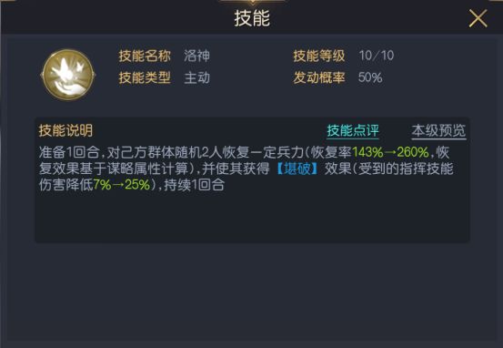 洛神的自带技能拥有高达260%的群体治疗效果,随着自身谋略属性的增长,治疗效果可进一步增加,在治疗的同时会为目标附加【勘破】状态,能降低受到的指挥技能伤害,在游戏中指挥技能属于必定发动的技能,这类技能最难防御,无法拼“人品”,勘破的减伤效果正好适用,两个效果都可以降低我们在开荒时的战损。
