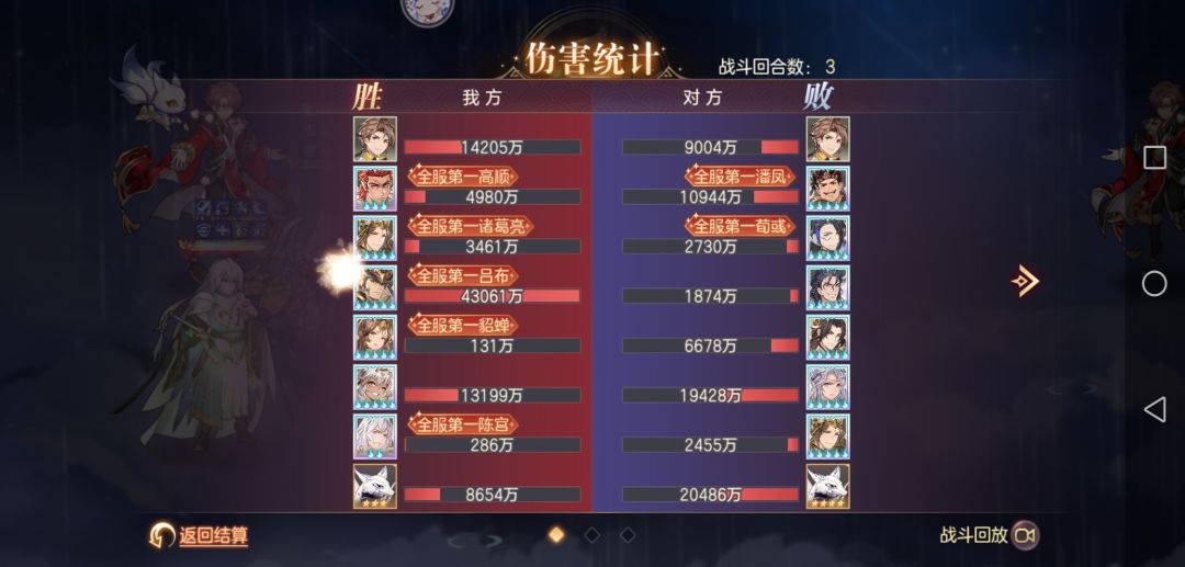 这是6.5亿的号,勉强越五千万打赢7亿的,真的丢人,花这么多资源打成这个样子。最后一个图是6.5打6.2被完爆,而且对面还打不过我自己号5.4亿。平时他风雷姜维打我吴蜀姜维是随便打,今天试了一下高顺陈宫姜维队,就打了一把被我暴打了