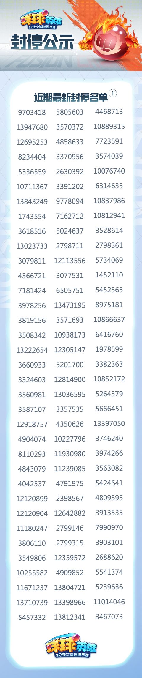 所以请各位球宝千万不要心存侥幸,一定要和我们一起,坚决抵制使用任何破坏游戏平衡软件的行为!对于使用外挂行为的玩家我们将持续进行公示,下面公示近期最新封停名单: