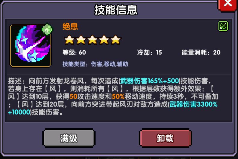 而且跑路速度相当快,【风】每层有1%的移速,而绝息的20层效果是可以吃到10层的效果,也就是必有50%移速和攻速